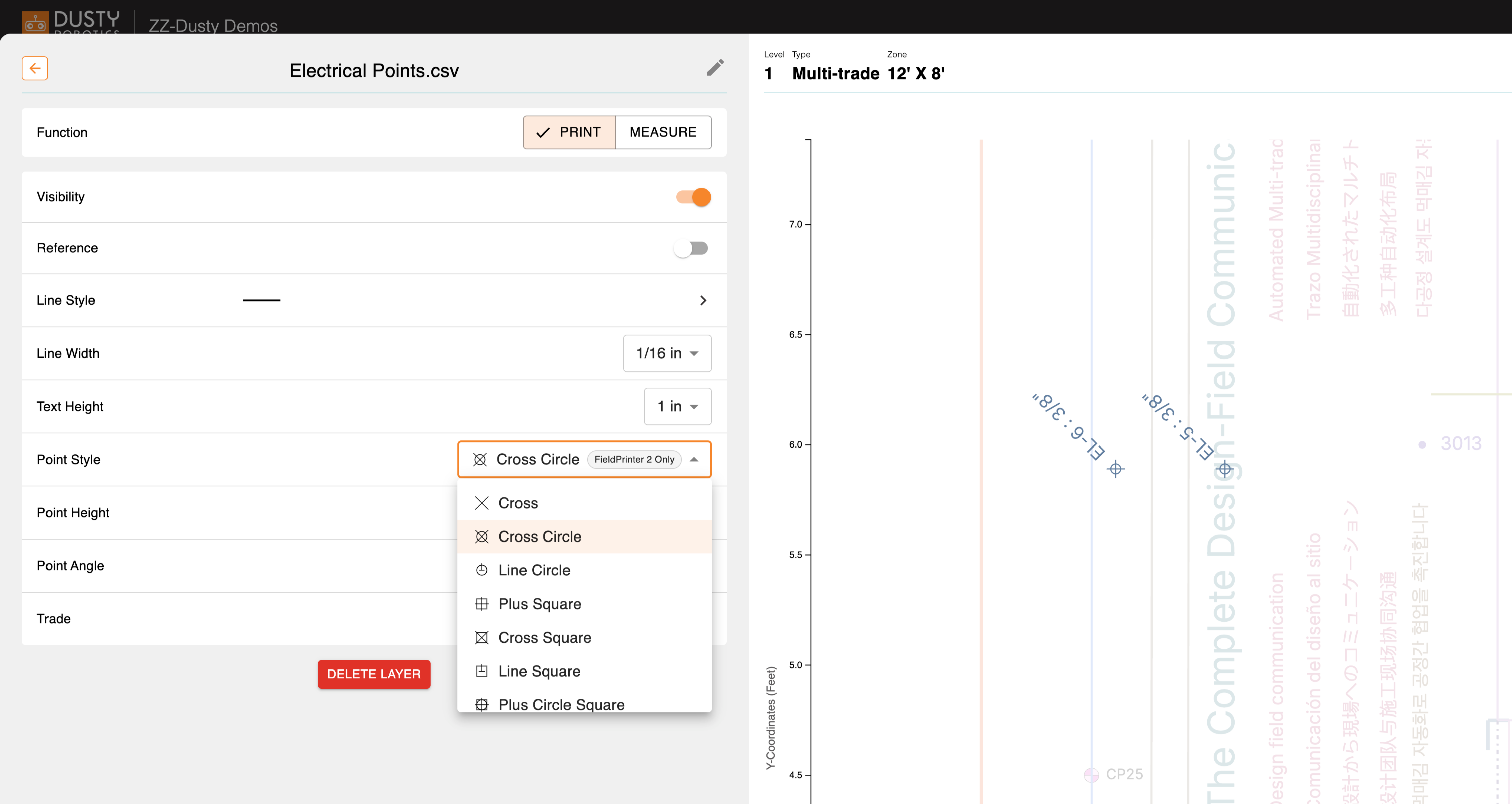 Point Styles allows FieldPrinter 2 to print trade layout points using a variety of distinct symbols — circles, squares, Xs, and more — directly on the floor. This helps everyone on site instantly understand which points belong to which trade, system, or discipline. Especially when combined with point rotation (which lets you use the rotation of points and their text labels to help indicate which trade they belong to), Point Styles bring a new level of clarity to your layouts.